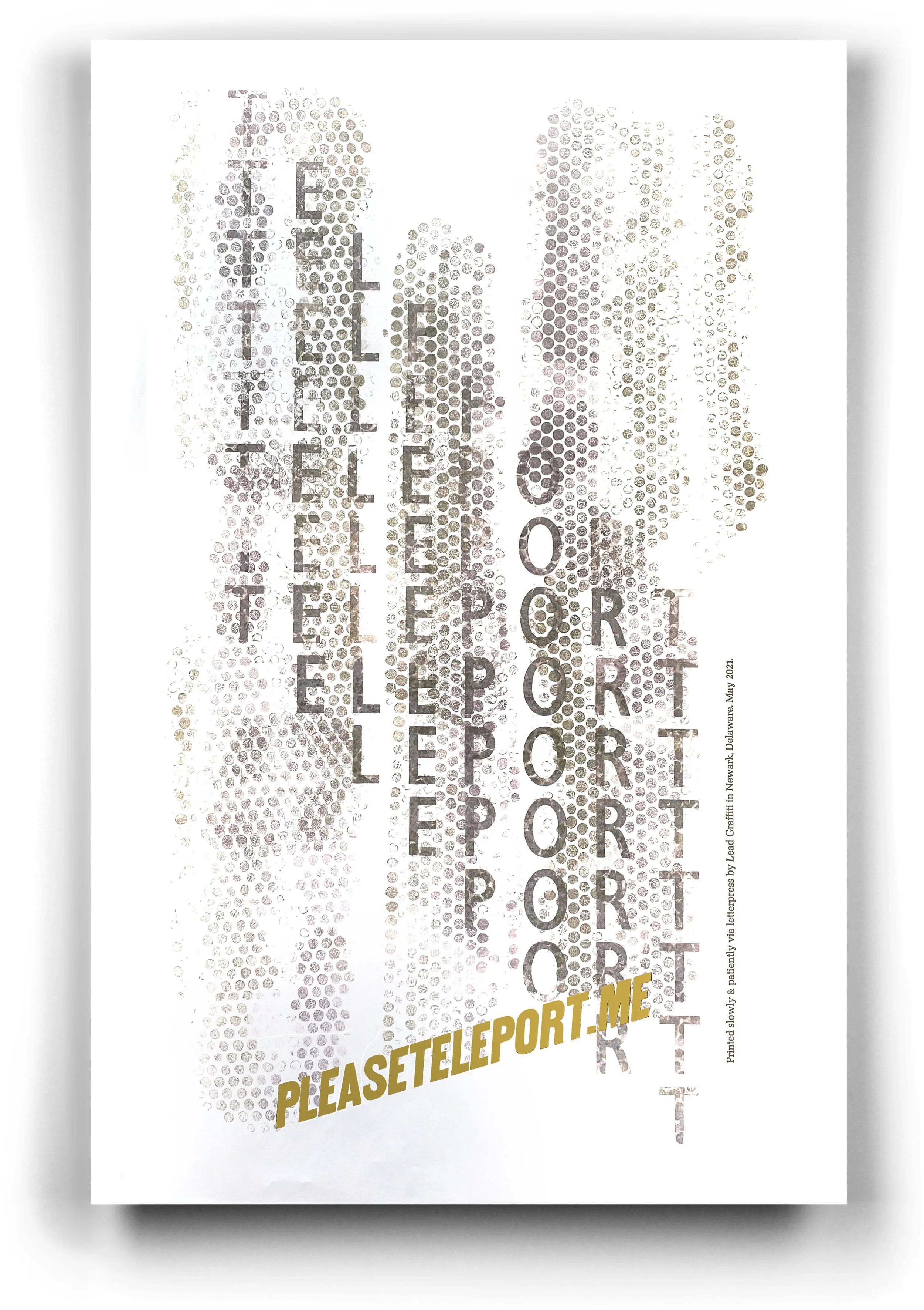 ⬆ This 25” x 38” broadside utilized the press size on our larger iron hand press to create a much larger piece than we can print on our Vandercooks. Printing the word “TELEPORT” took six runs as the wood type we used only had four capital Ts. “PLEASETELEPORT.ME” was the seventh run. Bubblewrap around a block of corrugated cardboard was inked with a hand brayer and overprinted about fifteen times to create the snakeskin texture.
